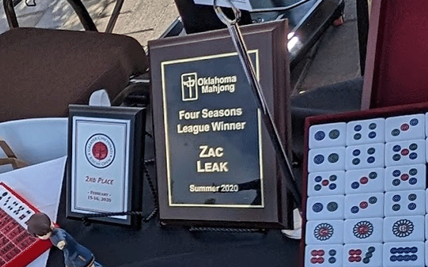 Declared a rare yakuman? As if the points weren’t enough, all members who score a yakuman in league play receive an Oklahoma Mahjong Club pin celebrating the victory.